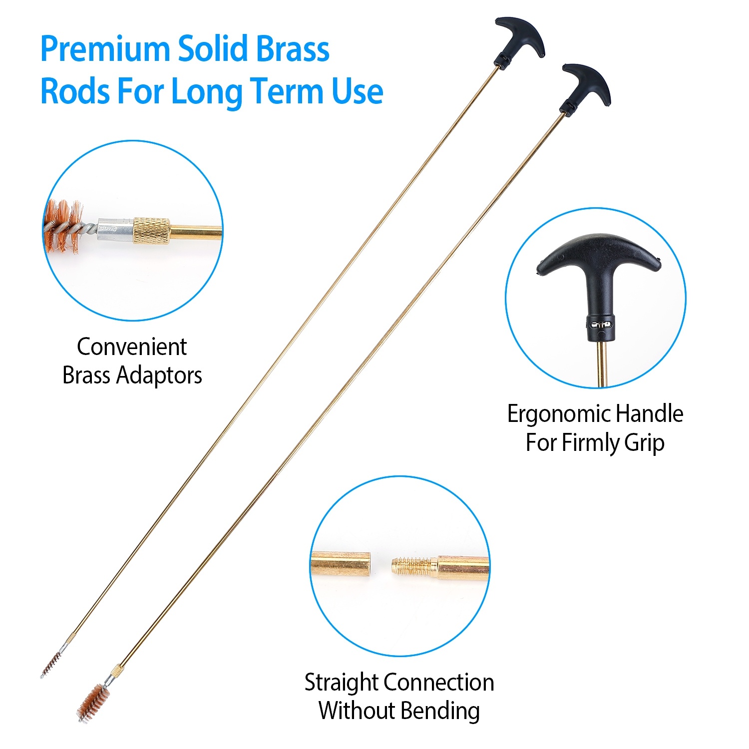 • **Sturdy and Reliable*: The handles in our gun cleaning kit are made from hardened plastic and adopts ergonomic design which provide a comfortable hand-feel when you are cleaning the inside of your gun. The cleaning mops adopt premium cotton fabric materials which will remove debris from the inside of your gun. And the wire brushes adopt sturdy brass materials which can help you remove stubborn debris efficiently.